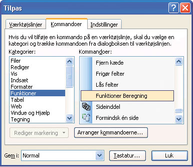 For at få den tilbage vælges Funktioner -> Tilpas og fanebladet Kommandoer. Vælg derefter Funktioner i Kategorier-listen til venstre, og i Kommandoer-listen til højre finder man nu Funktioner Beregning.