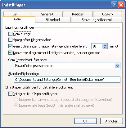Vælg nu fanebladet Gem og markér Spørg efter dokumentegenskaber. Når man fremover gemmer et dokument, vil Word spørge efter dokumentets egenskaber (for at tilføre et eksisterende dokument tilsvarende informationer vælges Filer -> Egenskaber).