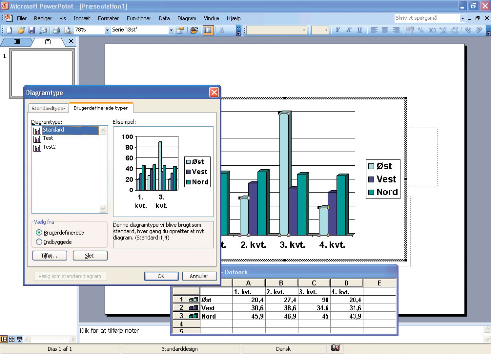 Dobbeltklik på et diagram i præsentationen og tilret det med de ønskede ændringer. Vælg nu Diagram -> Diagramtype samt fanebladet Brugerdefinerede typer.