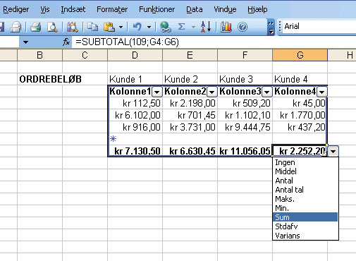 Denne funktion gør det også muligt at få opsummeret en kolonnes indhold på flere måder og ganske automatisk.