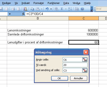 Indtast derefter referencen til den celle, der skal ændres for at opnå de 20 procent (som er lønudgifter-cellen) i feltet Ved ændring af celle. Klik nu på OK-knappen, og Excel vil forsøge at finde en løsning.