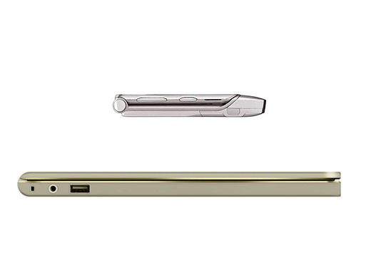 Det fås i forskellige farver og fastgøres til computeren via magneter. På den ene side af omslaget findes en skærm, der kan vise et billede eller ens kalender. Funktionen hedder Windows Sideshow og findes i dag allerede i Asus W5Fe, som vi tidligere har omtalt her.