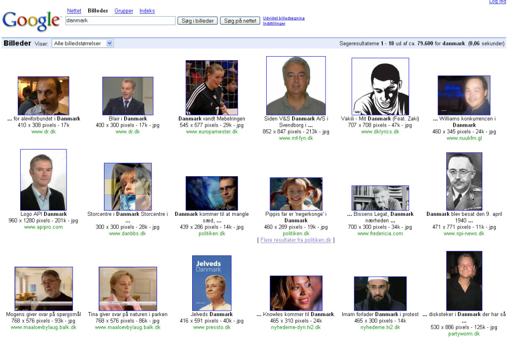 Prøv at lave en billedsøgning på "Danmark" i Google. På skærmen dukker en masse kort over Danmark op. Tilføj: "&imgtype=face" i slutningen af url-adressen på den søgning du lige har lavet og tryk return. Nu søger du kun efter ansigter.