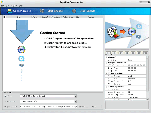 Any Video Converter er meget brugervenligt, og når du starter programmet op, kommer det selv frem med guiden ”getting started” og fortæller dig alt, hvad der skal vides, så du kan konvertere en videofil til MPEG-4 format.