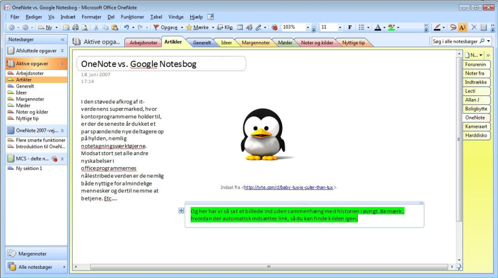 OneNote har tillige den store fordel frem for Google Notesbog, at man kan arbejde med det, selv om der ikke er nogen netforbindelse. For eksempel i toget. Ulempen er naturligvis, at det koster penge. Men de er nu i dette tilfælde givet godt ud.