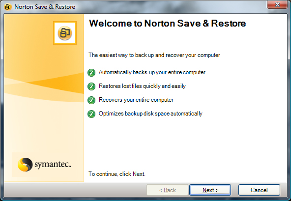 Tre alvorlige fejl er ved at sende Norton Save & Restore 2.0 til tælling, så Symantec havde en naturlig interesse i situationen. Problemerne er 1) Velkomstskærmen bliver ved med at dukke op igen og igen, når man starter pc'en. 2) En fejl E4BC0012 stopper backup-processen. 3) Når der tages backup bruges cirka 80 procent af pc'ens cpu-kræfter.
