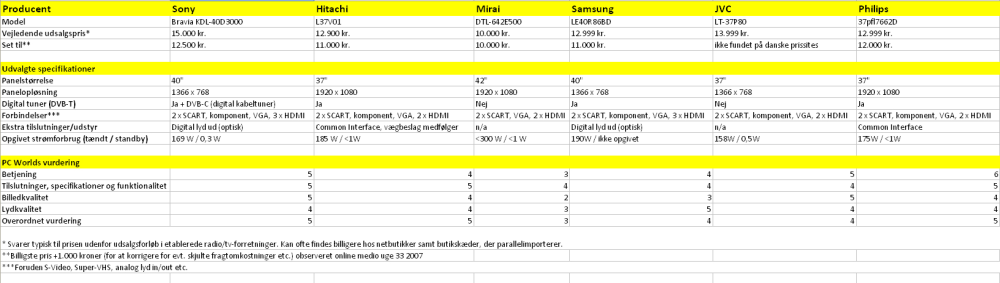 Men tilbage til testen. Vi indbød en lang række LCD-tv producenter til at sende os deres bedste apparat til maksimalt 15.000 kroner i størrelsesklassen 37 til 42 tommer. Det gjorde både Sony, Hitachi, Mirai, Samsung, JVC og Philips. Desuden indbød vi Medion og Toshiba, men uden held.