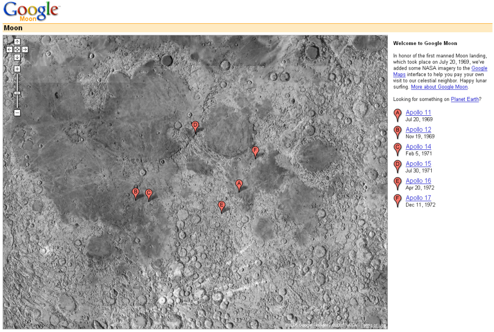 Google har med hjælp fra NASA samlet kort over Månen, så man kan surfe rundt på overfladen, og se præcis hvor Apollo-besætningerne landede. Som en bonus kan man læse, hvilke astronauter der var med, og hvornår de landede.