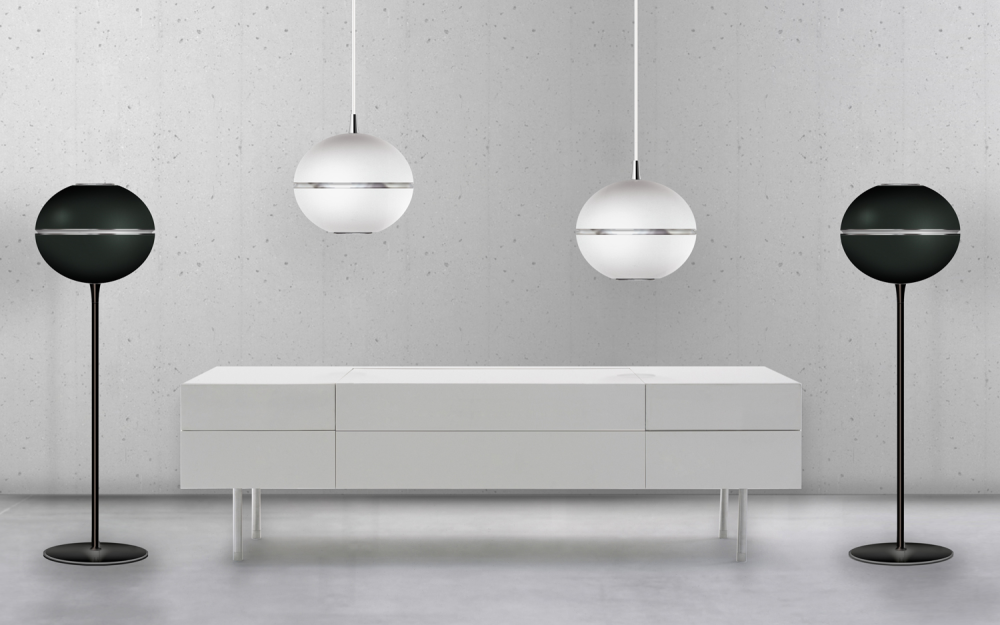 Højttalerne er kugleformede og spreder deres lyd ud til at alle sider, og de kan enten hænge ned fra loftet eller stå på et stativ på gulvet.