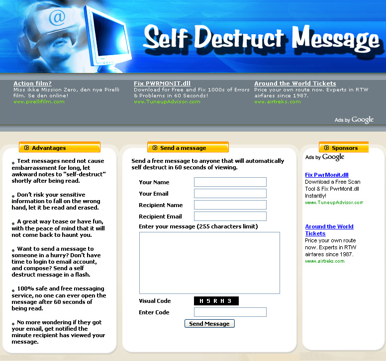 Vil du nemt og hurtigt sende en selv-destruerende mail så prøv www.sdmessage.com hvor du skriver mailen i en boks og sender den. Modtageren har 60 sekunder til at læse beskeden før: "The message you are trying to view has self destructeded, it is no longer available" kommer frem på skærmen.