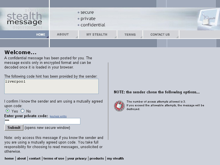 www.StealthMessage.com kan du kryptere din mail og bede modtageren om at indtaste en kode, før vedkommende kan læse den. Du vælger selv, om mailen skal destruere sig selv, og så kan du også undersøge, hvad der er sket med den mail, du har sendt. For eksempel om modtageren har afkodet meddelelsen.