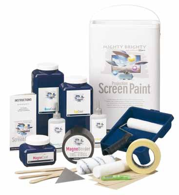 Med Mighty Brighty maler du ganske enkelt hele væggen i stuen, og malingen indeholder bittesmå stykker magneter. Det betyder, at du kan sætte en medfølgende sort tv-ramme op på væggen og fjerne den igen, hvis du ikke gider se film.
