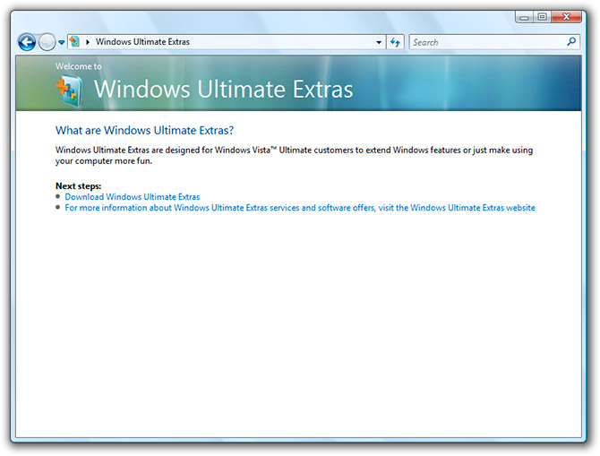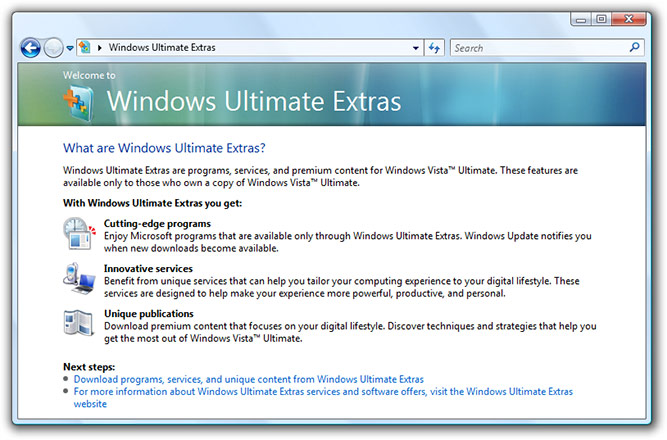 Men det var langt fra det hele. For under demonstrationen gjorde Microsoft også en del ud af at præsentere Ultimate Extras. Nemlig en lang række kommende funktioner og programmer, der udelukkende ville blive stillet til rådighed for de, der investerede i Vista Ultimate.
