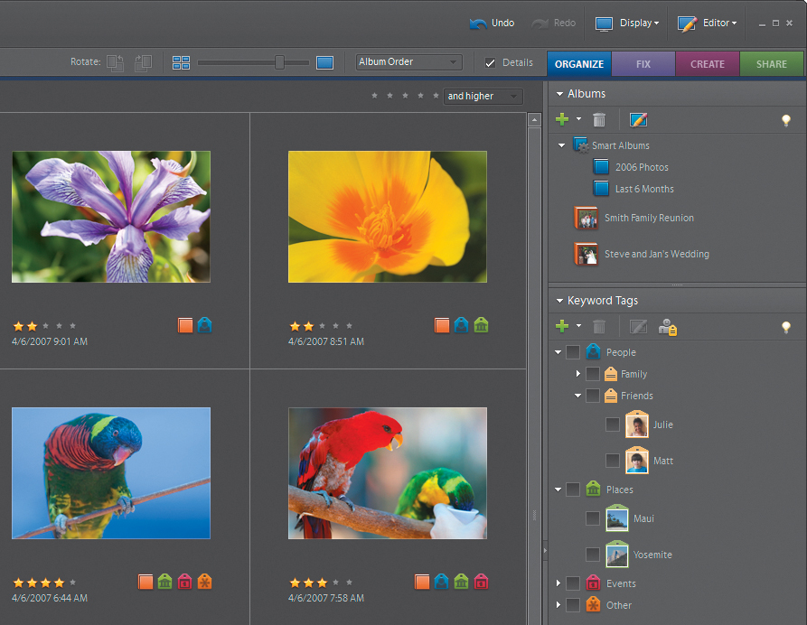 Adobe Photoshop Elements 6 har også gjort det nemmere at holde styr på din voksende samling af fotos. Du kan "tagge" billederne, og det vil sige, at du kan tilføje oplysninger til et fotos – eksempelvis "Onkel Knud", "Ferie" og "Hawaii" – og du kan tilføje stjerner, alt efter hvor godt fotoet er. På den måde vil du få nemmere ved at søge i din digitale billedsamling fremover.