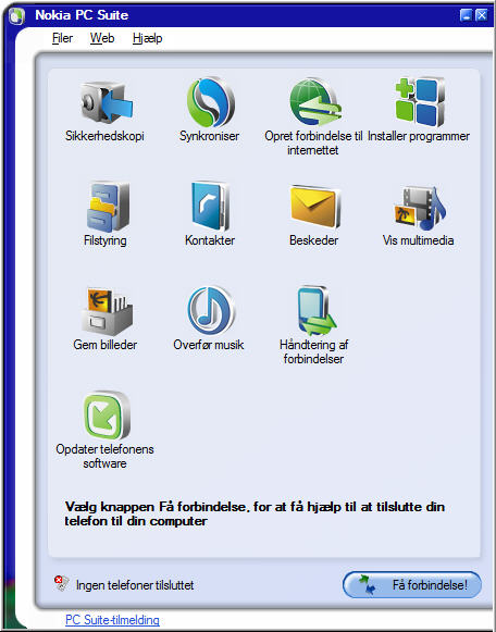 For at få forbindelse til mobilen skal du installere et program på din pc. Med vores Nokia 6210 skal vi bruge Nokias PC Suite, og det er en god idé altid at hente den nyeste version på www.nokia.dk i stedet for at installere den version, der følger med på en CD-ROM.