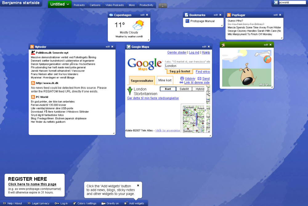 www.protopage.com er en personlig startside, som du kan indrette stort set, som du vil. Her er mange muligheder for at tilpasse siden med dine ønsker, blandt andet med hjælp fra en lang række widgets.
