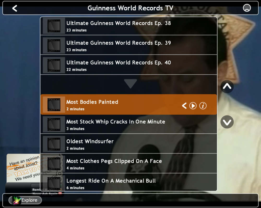 Joost byder på mere end 15.000 tv-show og 250 kanaler, der dækker sport, film, humor og meget mere. Blandt de mange kanaler kan du blandt andet finde DR, men også mere obskure kanaler som Pokerheaven, Australian Food TV, Wedding TV og Guinness World Records TV.