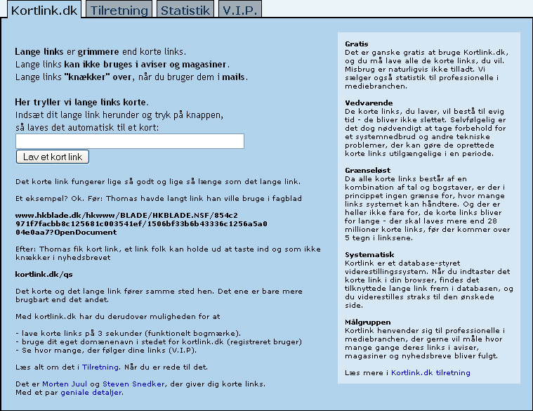 Derfor kan det være smart at lave de alenlange links om til korte. Det er der flere muligheder for at gøre på nettet. De to dansksprogede sider http://kortlink.dk og www.kortlink.com er ganske gratis at bruge, og det går hurtigt og nemt at trylle det lange link om til et kort.