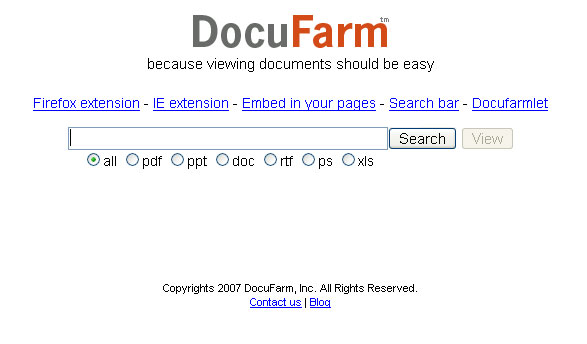 Du kan søge efter PDF'er, Word-dokumenter, PowerPoint-præsentationer med flere og se dem direkte på websiden, uden at du behøver at åbne det program, som normalt kræves for at se filen. Docufarm fås også som udvidelse til både Explorer og Firefox.