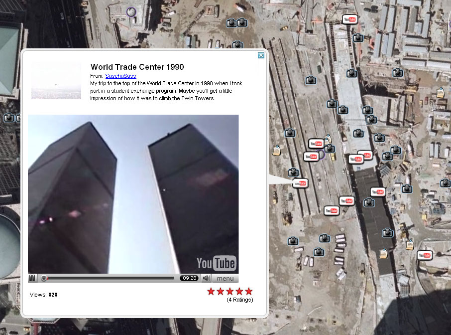 Klippene er markeret med et YouTube-logo og er naturligvis relateret til den geografiske placering. For eksempel kan du finde videoer fra Ground Zero i New York og Den Kinesiske Mur ved Beijing.