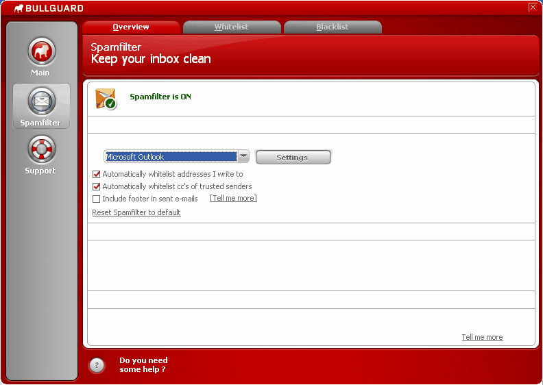 I forvejen er Bullguards Spamfilter en del af BullGuards sikkerhedsløsning Internet Security - der blandt andet har anti-virus, anti-spyware og firewall - og derfor har Bullguards nuværende kunder allerede spamfilteret.