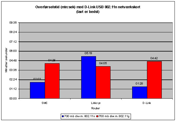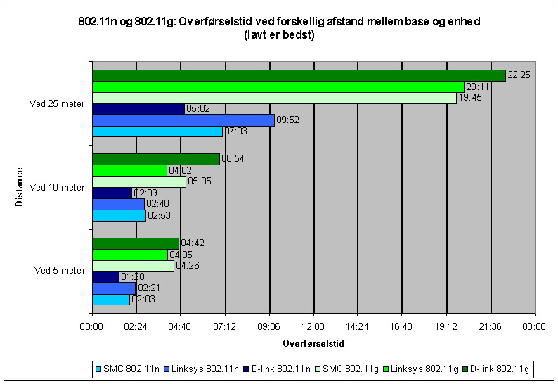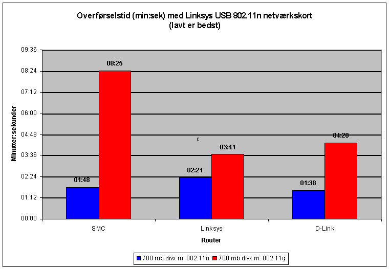 Vi opnåede med N-teknologien at overføre en film på 700 megabyte på 1:38 minut, hvilket svarer til 8,45 megabyte per sekund. Det hurtigste G-resultat blev 4:20 minutter, som svarer til 2,78 megabyte i sekundet. Altså en virkelig stor forskel når de to teknologier ydede deres bedste.