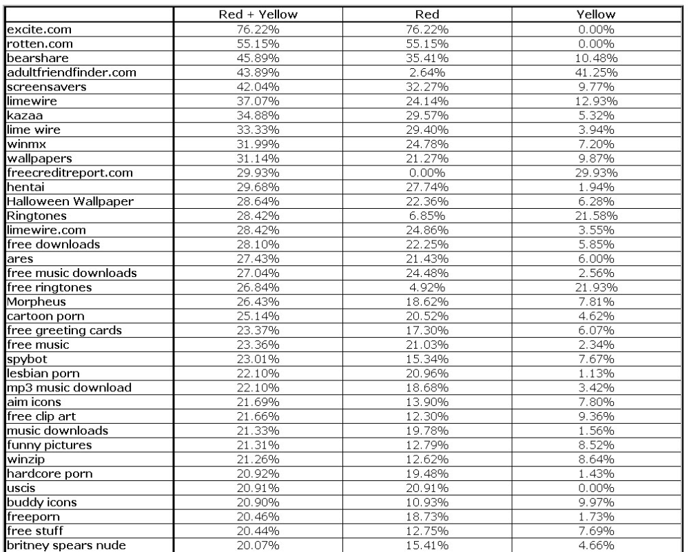 Fildelingsprogrammer hører naturligt nok også til i den farlige ende og søgninger efter 'bearshare', 'limewire' og 'kazaa' resulterede i mellem 35 og 45 procent farlige sider.