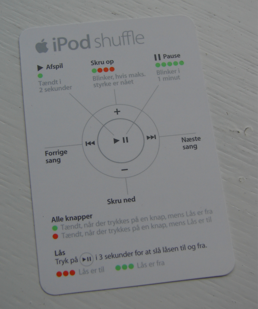 I sagens natur har Shuffle ikke voldsomt mange funktioner. Men betjeningen virker gennemtænkt - og er samtidig så enkel, at hele manualen er kogt ned til et lille skema i visitkort-format.