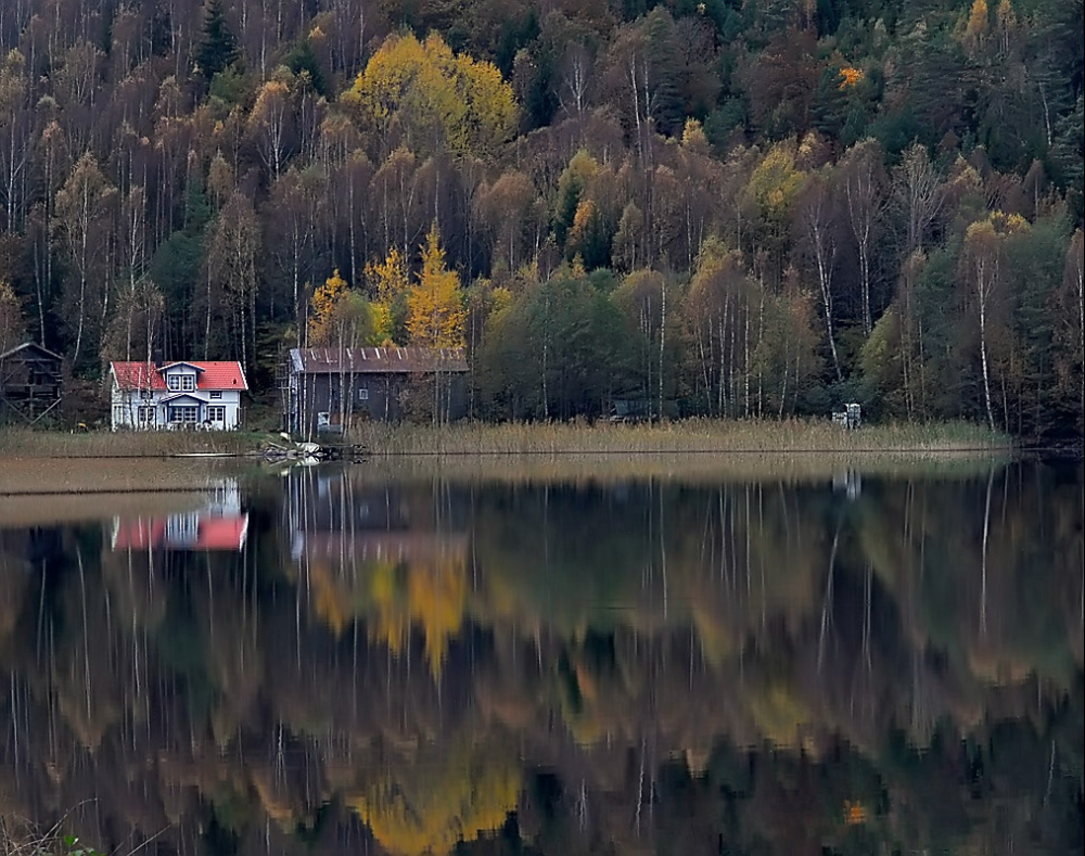 Billedet er taget af Jørgen Fusgaard og viser en stille sø med en flot genspejling af huset og laden.