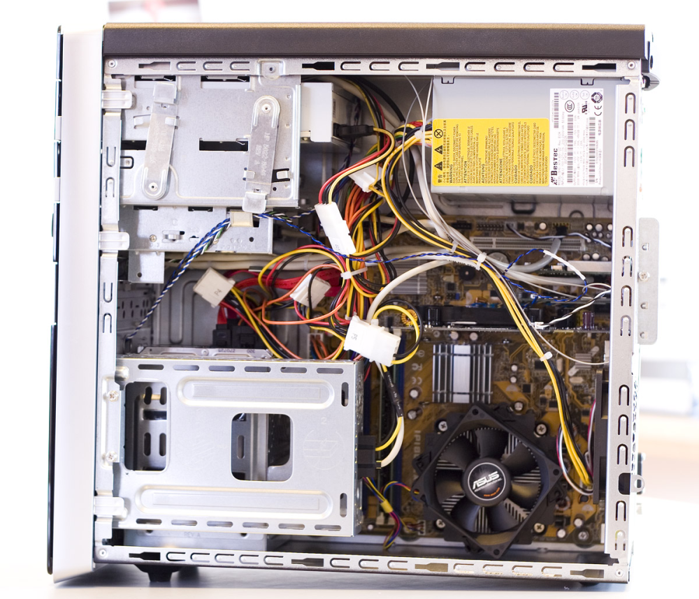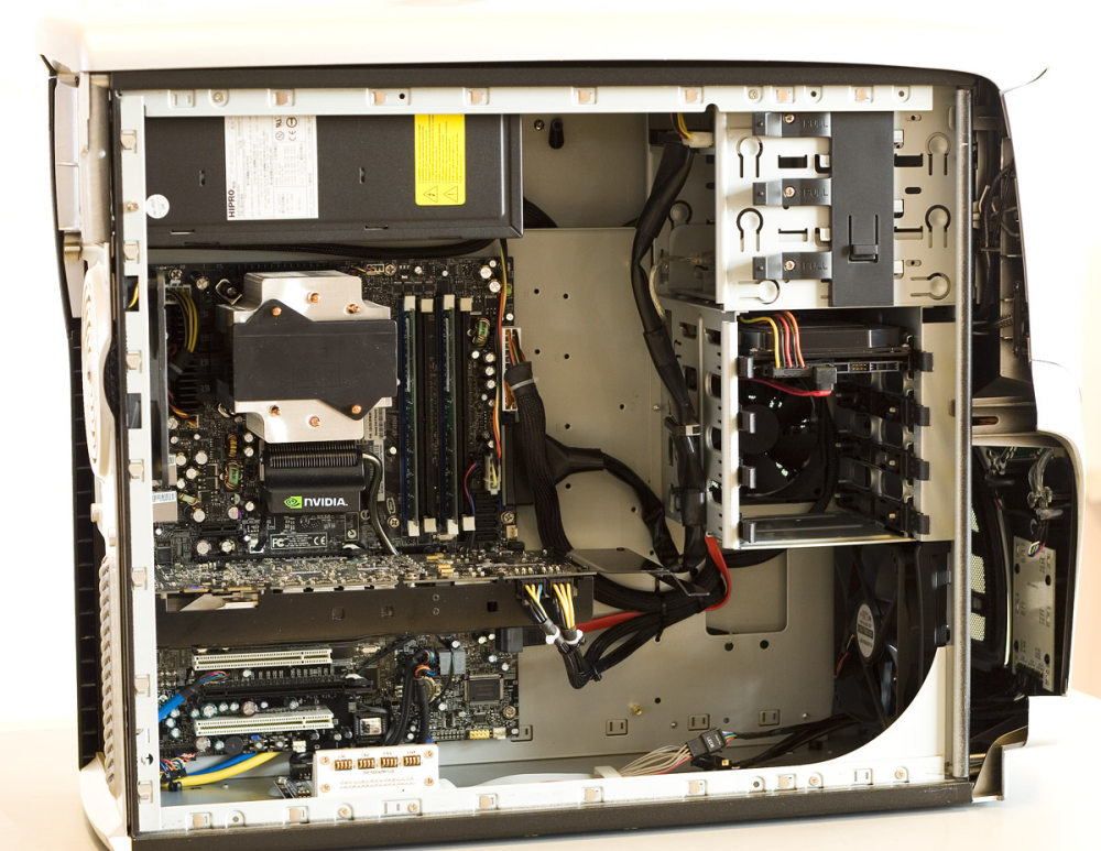 Også den indvendige del af kabinettet glimrer ved en nærmest fascistoid orden, stort set uden kabler og andre forstyrrende elementer. Bundkort og processor er passivt kølet, og tre store kabinetsblæsere sørger for rigelig luftgennemstrømning.