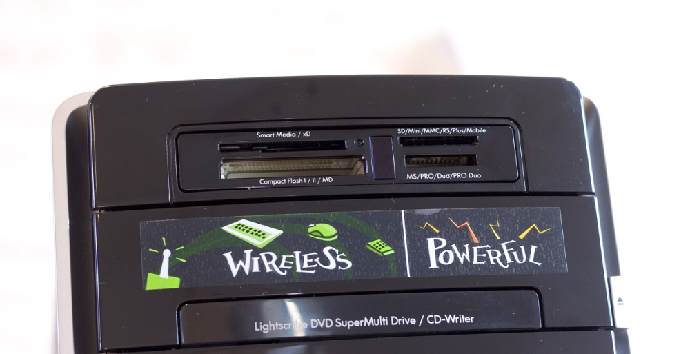 Trods utallige klistermærker – som man heldigvis kan pille af – og sin højglanspolerede sorte front er HP Pavilion Elite m9067 langt mere konservativt afdæmpet end Alienwares monstermaskine.