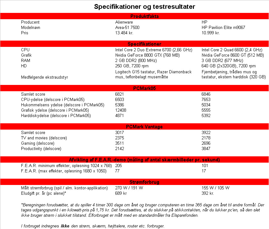 For ikke blot er HP-maskinens hukommelse en anelse sløvere i optrækket, men maskinens grafikkort – et Nvidia GeForce 8600 GT med 512 MB hukommelse – kan slet ikke følge med det langt kraftigere Nvidia GeForce 8800 GTX, der sidder i Alienware-maskinen. Og i den sammenhæng hjælper den hurtigere CPU heller ikke stort.