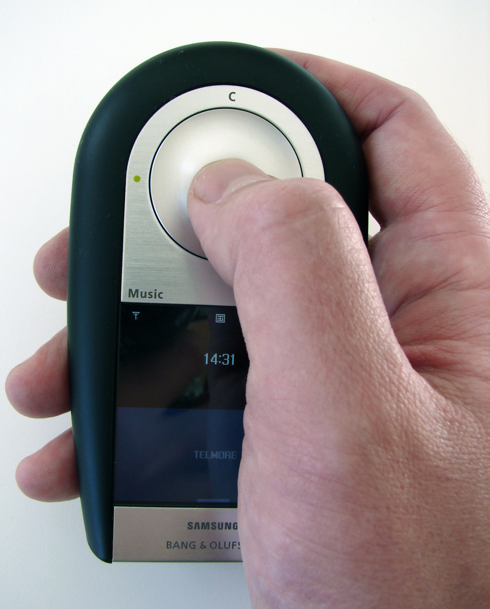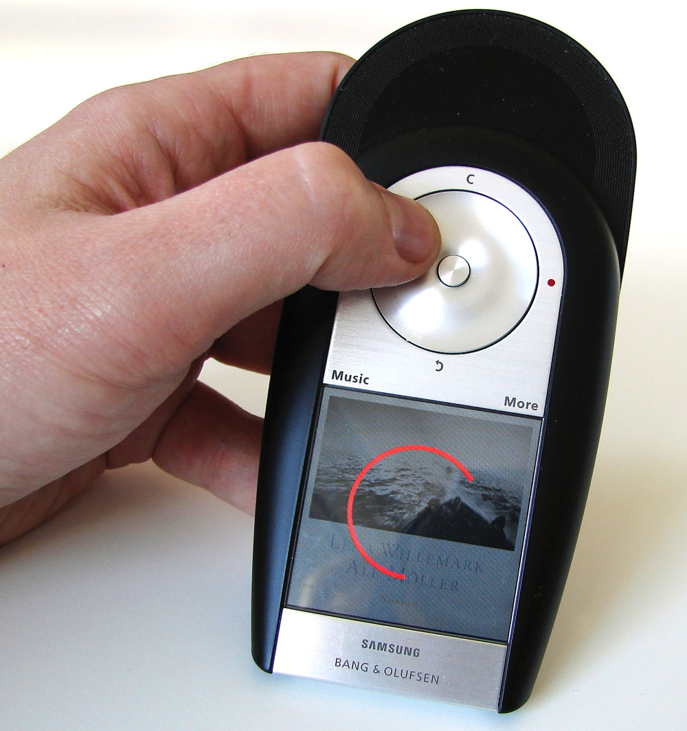 De fleste funktioner styres nemlig ved at føre tommelfingeren over det højt placerede drejehjul med knap i midten. Klikhjulet er ikke stjålet fra iPod, som mange tror. Tværtimod har Apple gaflet ideen fra B&O, der "opfandt hjulet" for over ti år siden med Beocom 6000 telefonen.