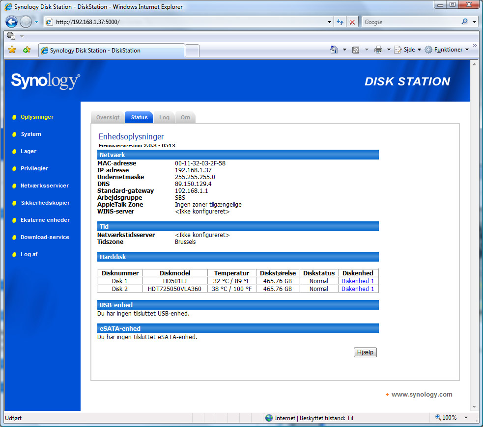 Vi opsatte DS-207+ i et arbejdsværelse med en rumtemperatur på cirka 21 grader, og her bevægede de to monterede harddiske sig op på henholdsvis 32 og 36 grader, hvilket er fint. Er man bekymret over diskenes temperatur eller status, kan denne følges live via det webbaserede administratorinterface.