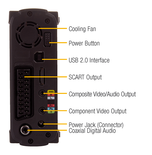 Forbindelsen til fjernsynet er desværre ikke HDMI, men klares til gengæld af component video - og eventuelt af en digital lydudgang. Er du endnu ikke så langt har PX-MPE500U også et SCART-stik, men så skal du ikke vente dig højere opløsning end normalt.