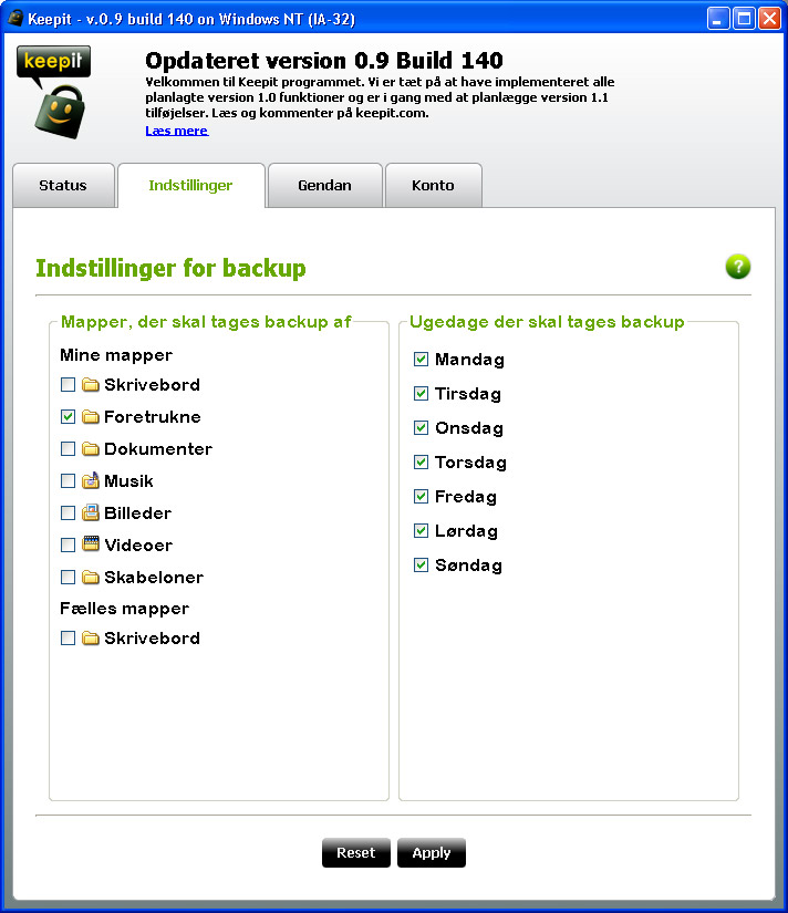 Du kan allerede nu prøve en version af keepit.com, men der er indtil i næste uge tale om en beta-version. Den er dog fuldt fungerede, men i vores mini-test kunne man kun vælge hele mapper, som for eksempel hele dokumentmappen. Produktchef Kresten Bach Søndergaard understreger dog, at netop den funktion er en del af version 1.0, som lanceres i den kommende uge.