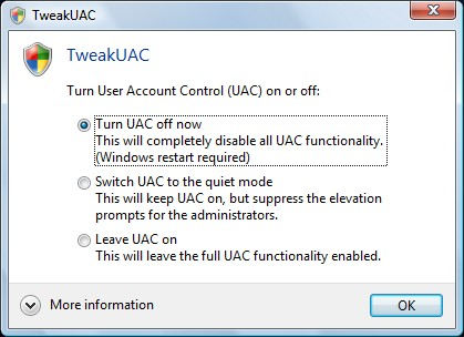 Man kører det blot, hvorefter man får tre valgmuligheder: 1) "Turn UAC off now" slår brugerkontostyringen fra på samme måde, som hvis man gjorde det via Kontrolpanelet. 2) "Switch UAC to the quiet mode" fjerner sikkerheds-bekræftelserne for administratorer ved at køre brugerkontostyringen i "quiet mode". Almindelige brugere vil ikke opleve nogen ændring. 3) "Leave UAC on" tænder for brugerkontostyringen igen.