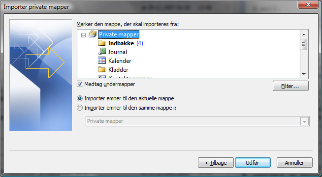 5. Vælg private mapper i toppen, og at der skal importeres i den aktuelle mappe. Husk eventuelt at medtage undermapper.