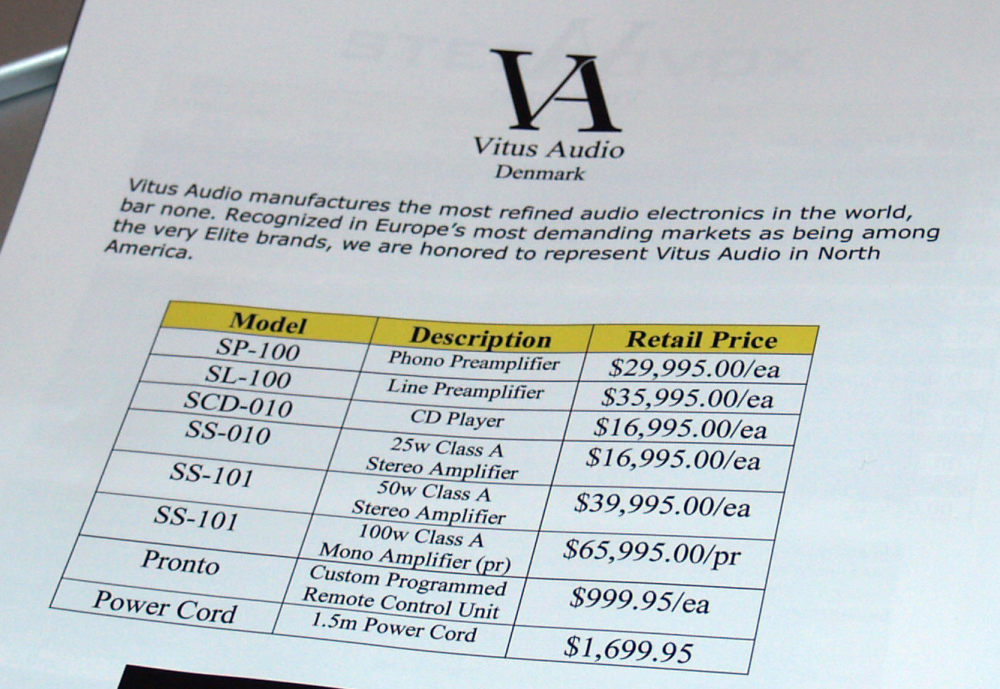 Når man studerer prislisten for de danske high-end audio produkter fra Vitus, der blev vist frem på 30. etage i Venetian Tower under CES, kan man ikke andet end glæde sig over, at i det mindste det 1,5 meter lange strømkabel ikke har en femcifret prislap - i dollar!