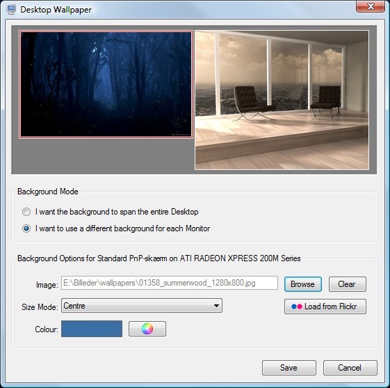 Der kræves Microsoft .NET Framework 2.0 installeret, og programmet kan bruges både til at styre baggrundsbilledet på en enkelt skærm (eller to, som beskrevet), men skulle også kunne styre flere skærme, hvis man har sådan et setup. Programmet er helt gratis, men donationer til John Tackabury vil blive værdsat.