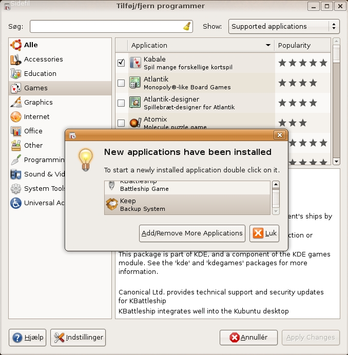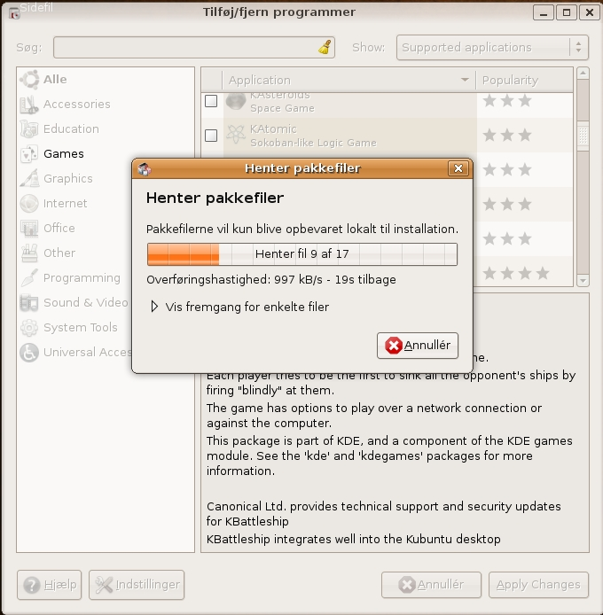 Når du har markeret alle de programmer, du gerne vil have lige nu, klikker du på Apply changes, hvorefter Ubuntu beder dig godkende, at alle de valgte programmer installeres.