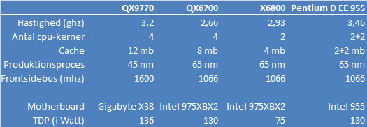 Til sammenligning har vi samlet resultaterne fra de tre forrige topmodeller fra Intel, som har besøgt PC World HQ. Det drejer sig om quadcoreprocessoren QX6700, dualcoreprocessoren X6800 samt Pentium D 955 EE.