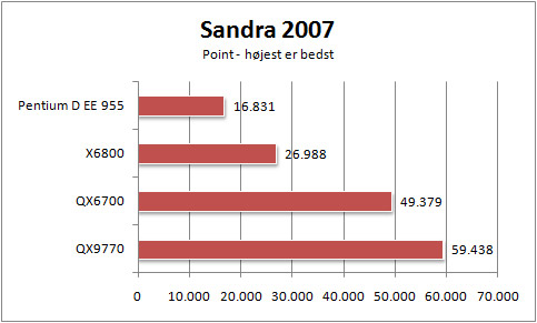 Samme mønster gør sig også gældende ved de øvrige test, som vi lod QX9770 gennemgå. I SiSoft Sandra 2007 var QX9770 således fortsat suveræn, men trækker vi de 20 procents clockfrekvensforspring fra i forhold til QX6700, ikke fuldstændig overbevisende.
