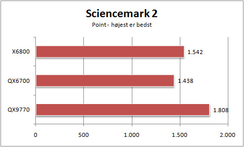 Sciencemark 2 er den sidste test, vi har kørt. Denne benchmark læner sig op ad en række kemiske beregninger og er glad for høje clockfrekvenser. Det betød, at da vi testede quadcoreprocessoren QX6700 tabte den til den, på papiret, svagere dualcoreprocessor X6800.