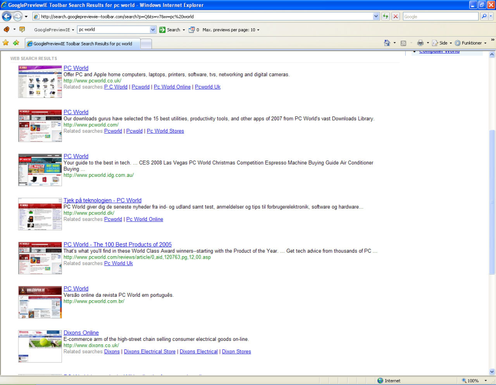 Med GooglePreviewIE kan du søge i for eksempel Google og Yahoo og få vist en thumbnail til hvert søgeresultat. På den måde kan du se siden, inden du klikker ind på den. Det er meget praktisk, hvis du søger efter et billede. Thumbnails kommer kun frem, hvis du søger via den toolbar, der bliver installeret i browseren.