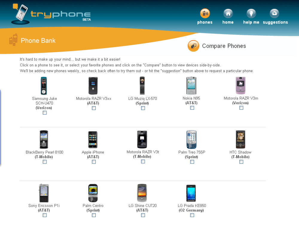 I skrivende stund er der 14 mobiltelefoner tilgængelige på TryPhone, blandt andre Nokia N95, Sony Ericsson P1i og Apples iPhone, men der kommer løbende flere til.