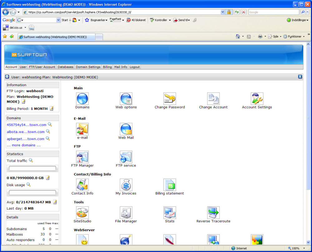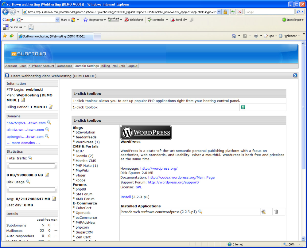Er du til den lidt mere avancerede løsning, så kan Surftown også tilbyde en super nem 1-click installation. Med blot et enkelt klik kan du direkte via Surftowns kontrolpanel installere de mest eftertragtede PHP-baserede applikationer, herunder WordPress, Joomla!, Mambo CMS, PHPnuke, phpBB og mange flere.
