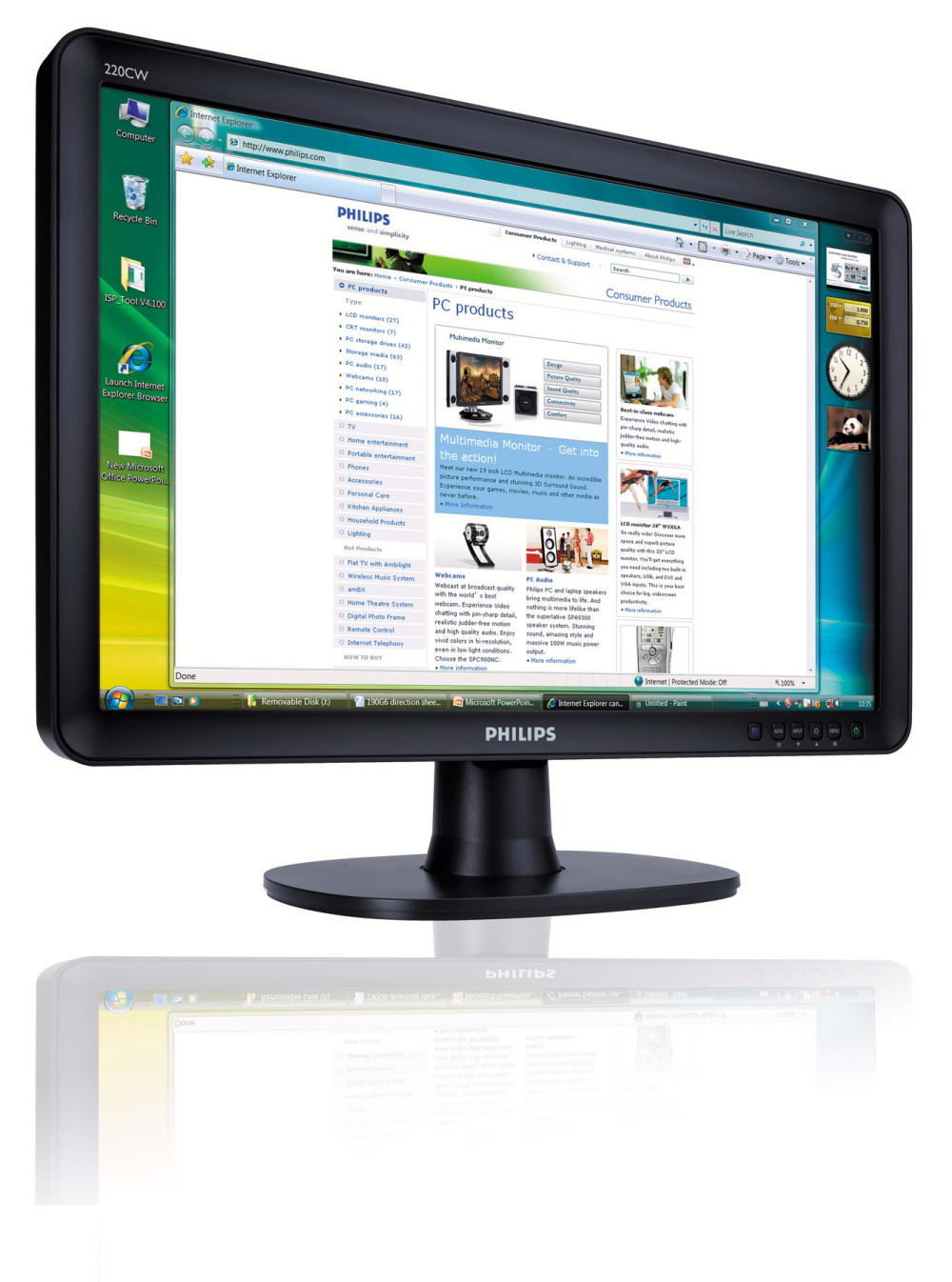 Philips 220CW8FB er udført i skinnende blank plastic med rundere hjørner for et mere moderne indtryk. Selve skærmen er skabt med en mat overflade, som er testens bedste til at håndtere sollys. Farverne står dog stadig flot, men ikke så levende som på en skærm med blank overflade. Til gengæld slipper du for at spejle dig i skærmen.