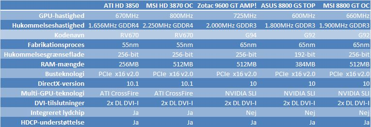 Til denne stortest har vi modtaget i alt fem aktuelle mellemklassekort fra de to dominerende producenter, ATI og Nvidia, den dyreste model koster cirka 1.800 kroner, mens du for den billigste må bøde godt 1.000 kroner. Fælles for modellerne er, at de alle er fremstillet til PCI Express 2.0-grænsefladen.