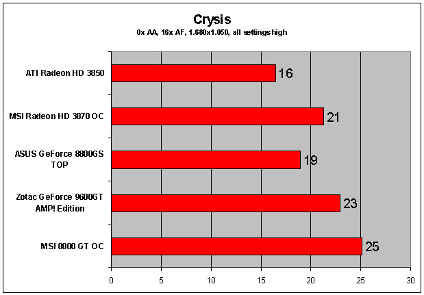 Det så meget lyst ud for HD 3850, der indtil nu har efterladt Nvidias GeForce 8600-serie i støvet. Med lanceringen af GeForce 9600 GT må vi imidlertid understrege, at HD 3850 har fået stor konkurrence. Samtidig fremhæver testresultaterne, at kort baseret på denne chip leverer en spiloplevelse i Crysis, der ikke er tålelig.
